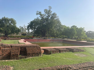 The master plan included the central circle that comprises the Mayadevi temple, the sacred garden, and the archaeological ruins of monasteries and the temple. The new Mayadevi temple was built on the ruins of the old temple, and there is a wooden walkway that goes around the other ruins, most of which date back to the Gupta period (5th-6th CE.) The temple has a lot of stupas in the vicinity, but the most interesting ones are a set of 16 stupas built on one square base.