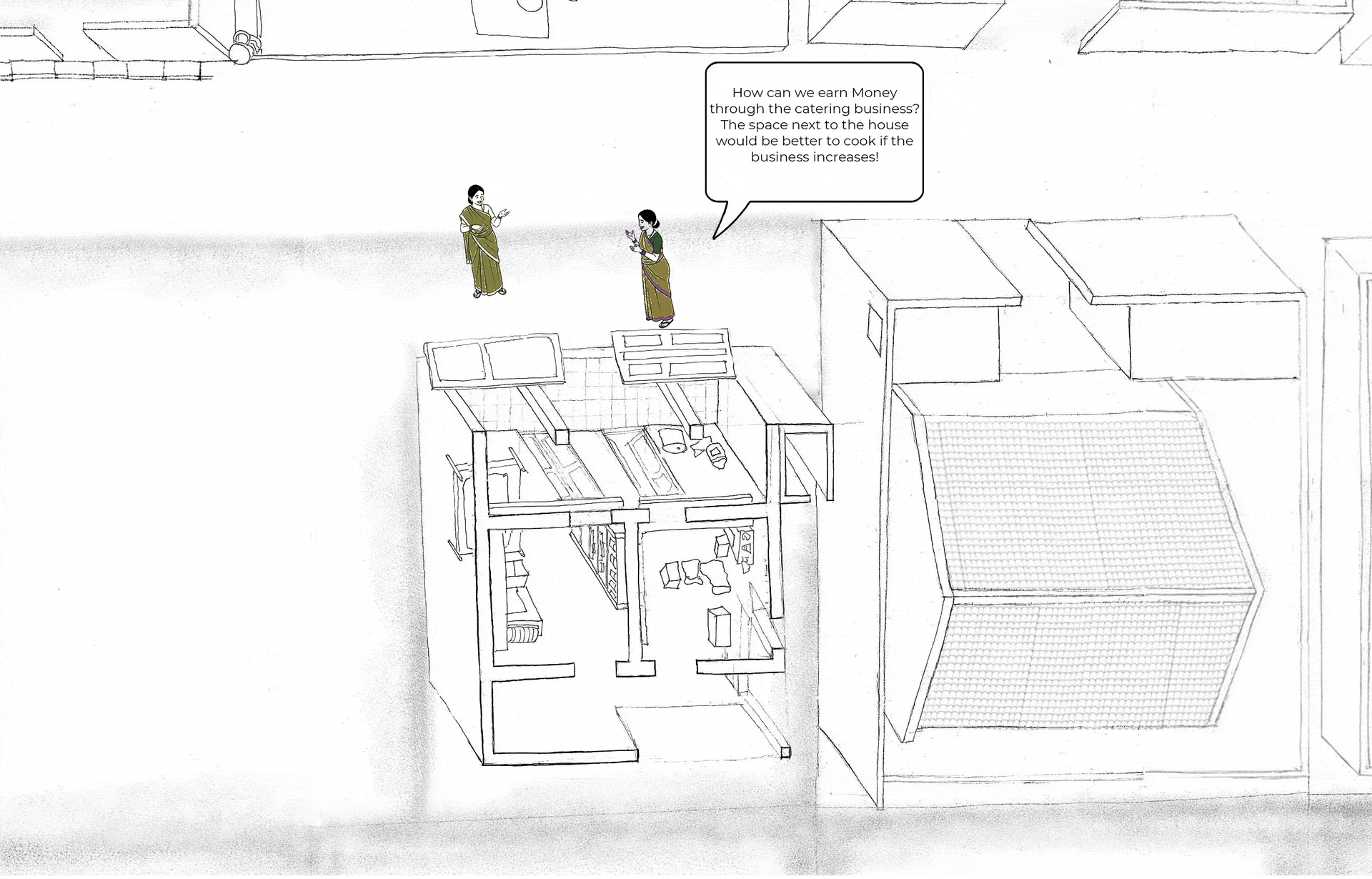 The son now lives in the new house, while the mother utilizes its verandah for her catering work. This space has become essential during the monsoon season, providing a much-needed shelter when outdoor cooking is impossible.