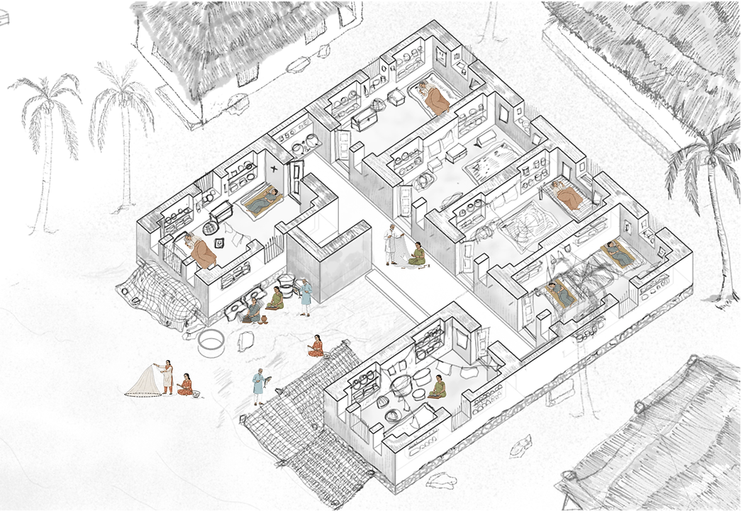 Originally, a joint family of nearly 25 members lived together near the coast, relying primarily on fishing as their livelihood. Following the cyclone of 1995, increasing environmental vulnerability forced the family to move closer to the village. Alongside climatic pressures, the expansion and eventual division of the family led to changes in the house form, transforming a shared collective dwelling into more fragmented living arrangements.